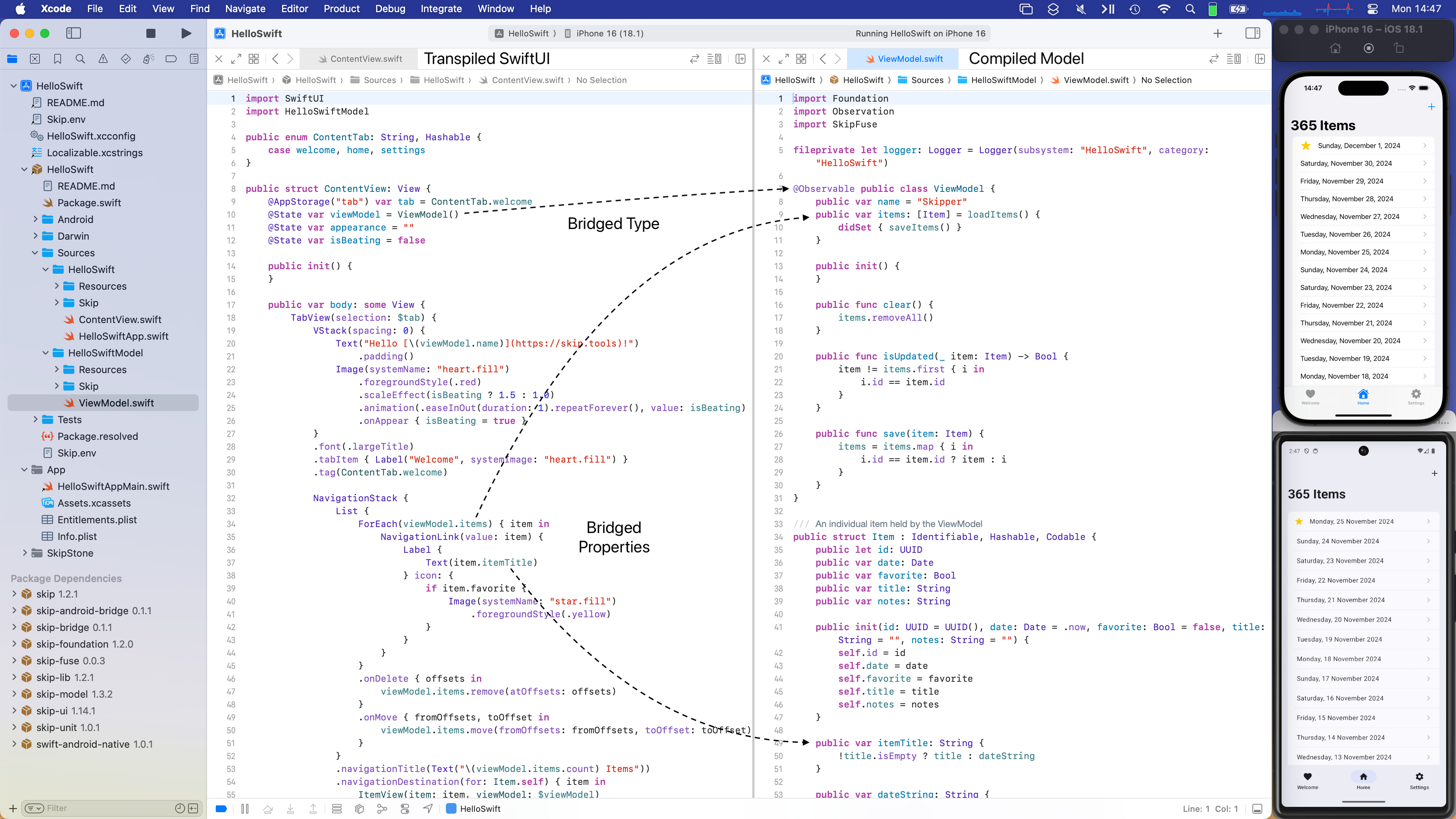 Section titled “ViewModel.swift”The “Items” tab displays an editable list of items which are managed by Sources/HowdySkip/ViewModel.swift ↗, which handles loading and saving the list of items to a simple JSON file. This code uses standard Foundation types (URL, Data, Date, FileManager, JSONEncoder, JSONDecoder, etc.) to handle the management and persistence of the items. Note that unlike the SwiftUI in ContentView, none of this code is bridged into Kotlin: it is using the Apple swift-foundation ↗ types directly, just as on iOS.