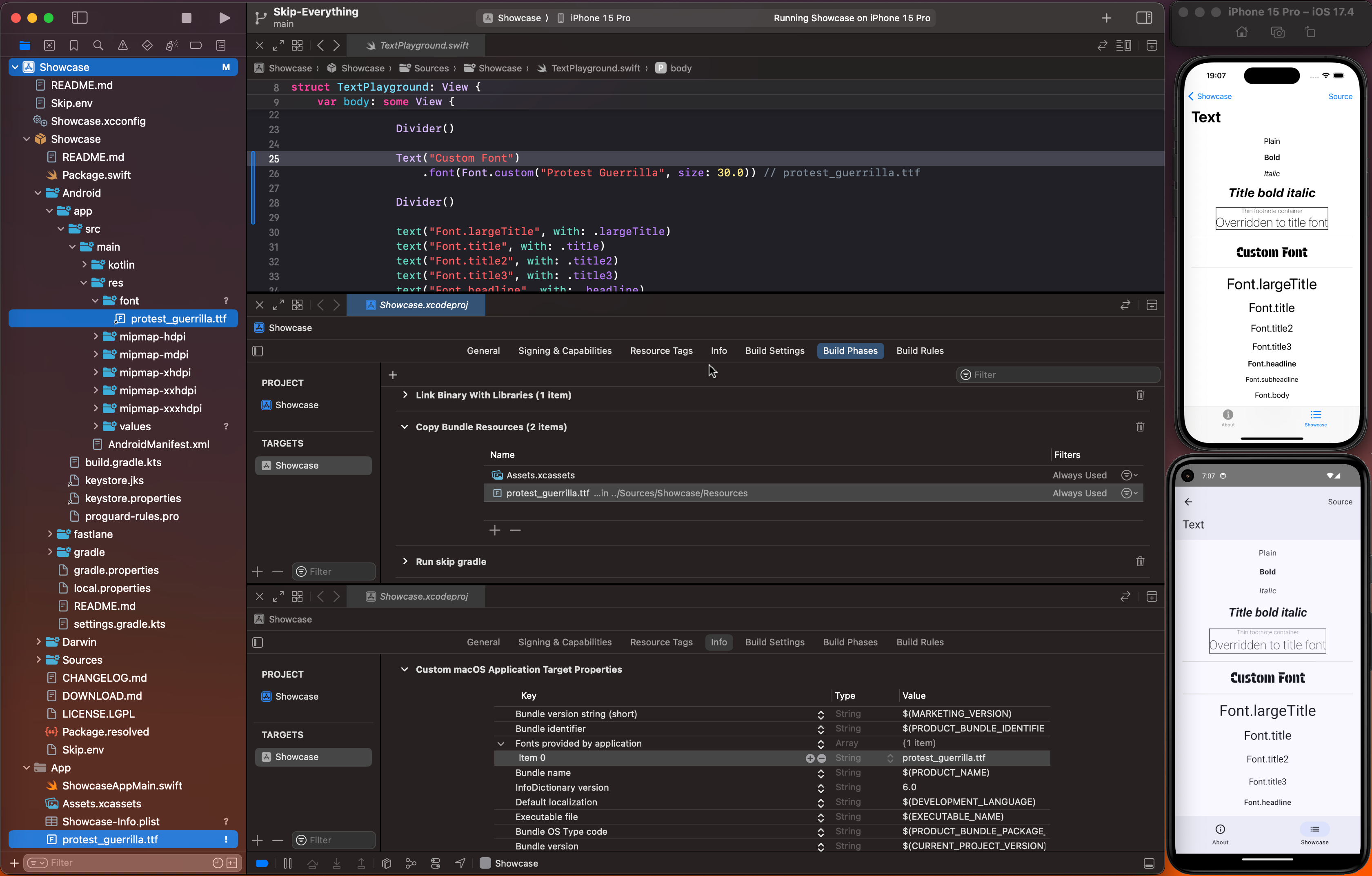 #if SKIP @Composable override func Render(context: ComposeContext) { let modifier = context.modifier let font = EnvironmentValues.shared.font ?? Font(fontImpl: { LocalTextStyle.current }) ... androidx.compose.material3.Text(text: text, modifier: modifier, style: font.fontImpl(), ...) } #else public var body: some View { stubView() } #endif}As you can see, the Text type is defined just as it is in SwiftUI. We then use an #if SKIP block to implement the composable Renderable.Render function for Android, while we stub the body var to satisfy the Swift compiler. Render makes the necessary Compose calls to render the component, applying the modifier from the given context as well as any applicable environment values. If Text had any child views, Render would call child.Compose(context: context.content()) to compose its child content.